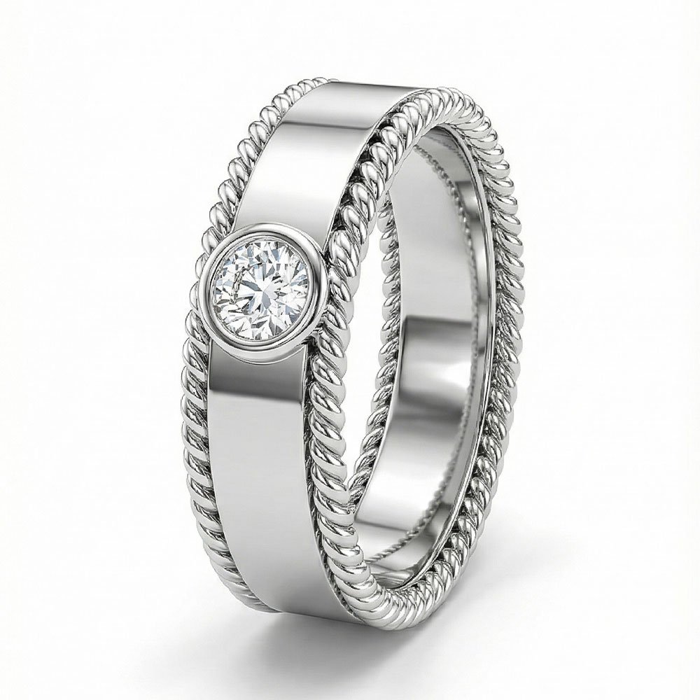 Featuring a round brilliant-cut stone in a sleek bezel setting, the design delivers a clean, modern look with refined sparkle.Unique Rope Edge Detailing