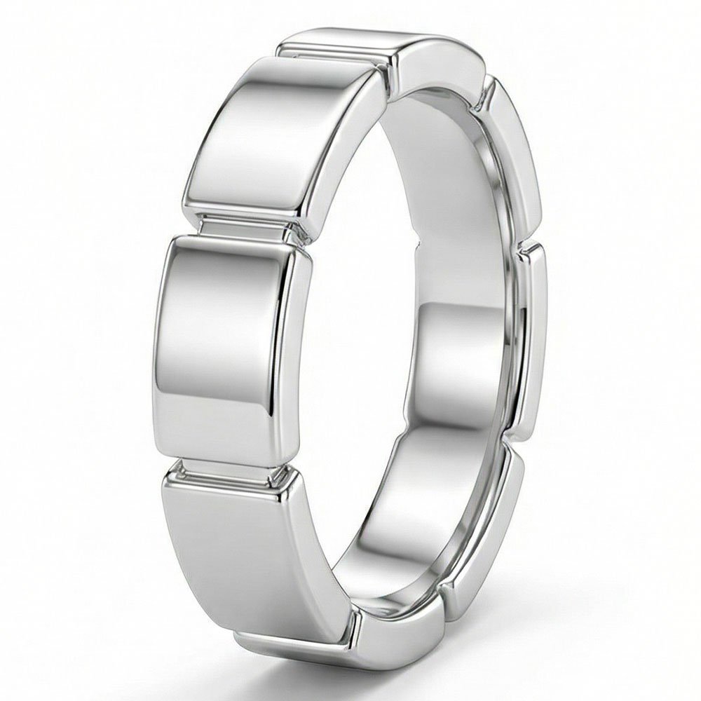 • Unique Segmented Geometry: This ring features a distinctive “block” or segmented link design, creating a bold, industrial aesthetic that stands out from traditional smooth bands.